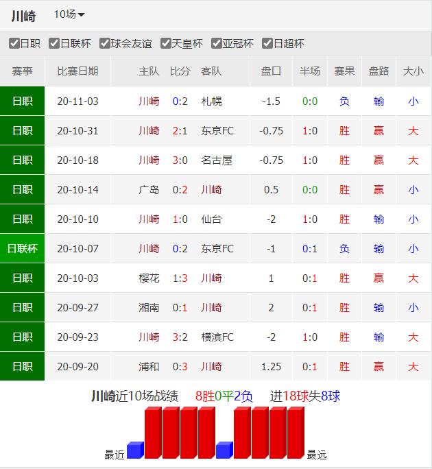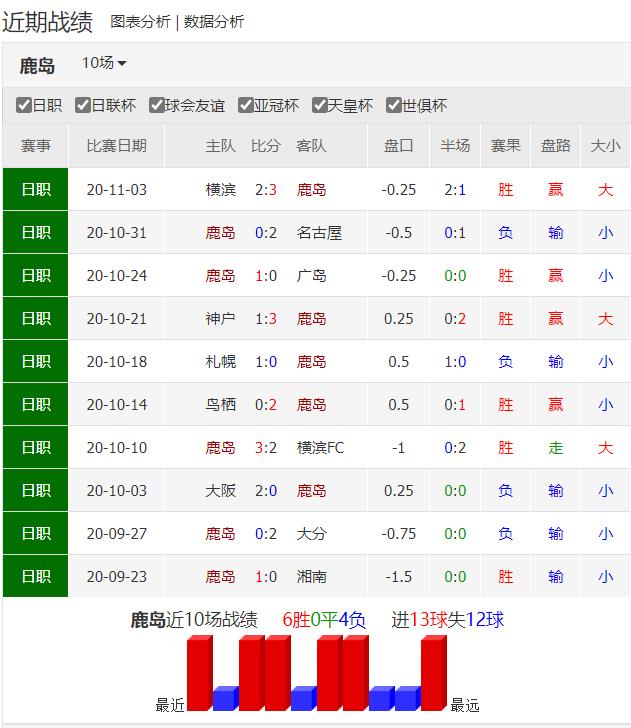 近年新贵川崎前锋本赛季日职联26轮积68分高居榜首,大有17、18赛季夺冠之势。近13次对阵鹿岛鹿角7胜5平仅1负,堪称对手克星。新星三笘薫是本赛季J1打入3球以上的球员中射门转化率最高的,且最近4次首发出战均参与球队进球。上轮主场0:2脆败给近况不错的札幌冈萨多,J1历史最长的12连胜纪录就此止步。近2个客场面对强队广岛三箭和大阪樱花均净胜两球,尽管场面上并没有明显优势。