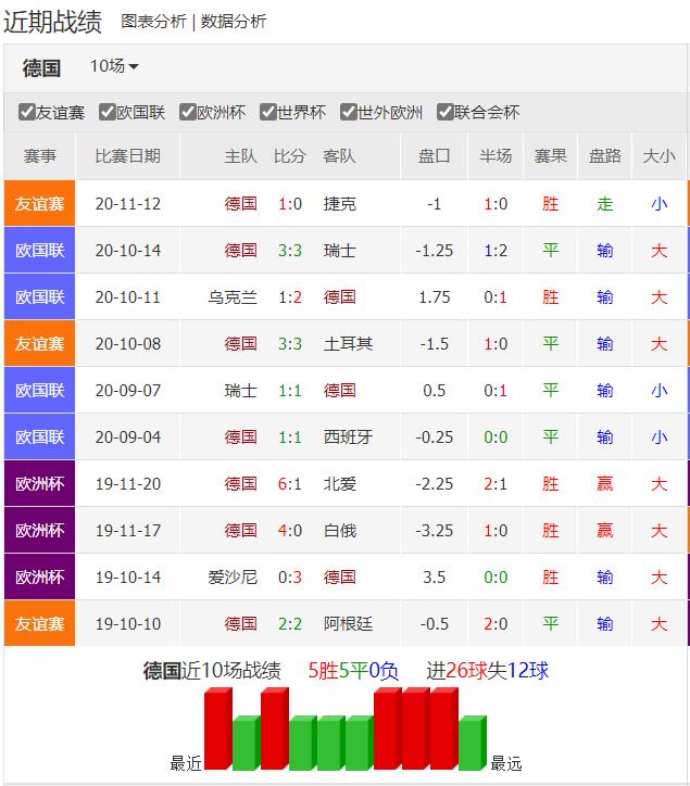 德国国际排名第14,欧洲第9。目前在欧国联(A)排名小组第2,与第3名乌克兰同分。首回合与乌克兰交手客场2比1获胜,中卫金特尔和中场格雷茨卡为德国建功,乌克兰的几球来自马利诺夫斯基的点球。主力中锋维尔纳,拜仁左右主力边锋萨内与格纳布里都皆入选本期国家队大名单,德国队前场火力十足。主帅勒夫已弃用拜仁中卫博阿滕和多特蒙德中卫胡梅尔斯,结果导致德国4场欧国联比赛场场丢球,防守质量令人失望。在本战之前的友谊赛中1比0主场小胜捷克,前锋瓦尔德施密特上半场为球队建功。德国队也连续5场国际比赛半场破门。主力后腰基米希因伤无缘本期国家队,另外新锐前腰哈弗茨也落选大名单,使德国中场实力有一定削弱。