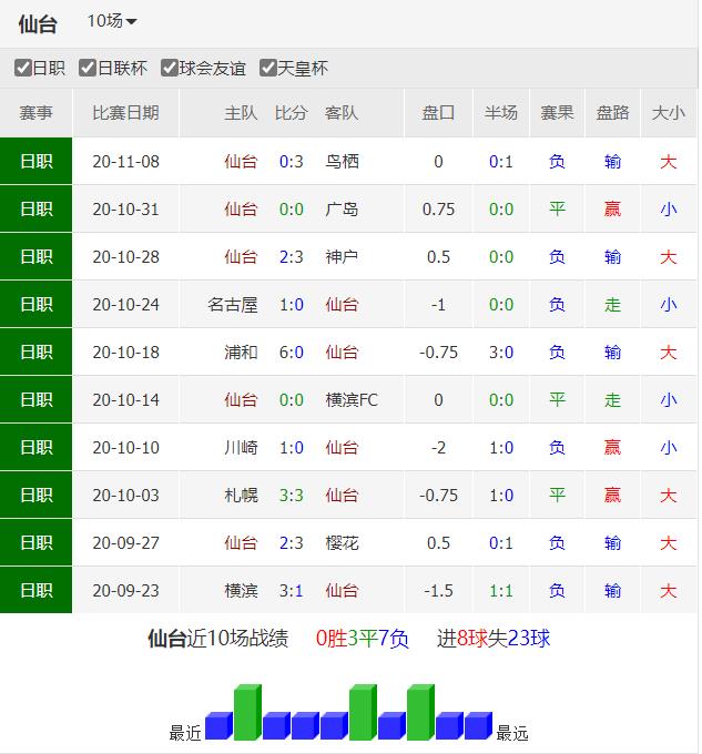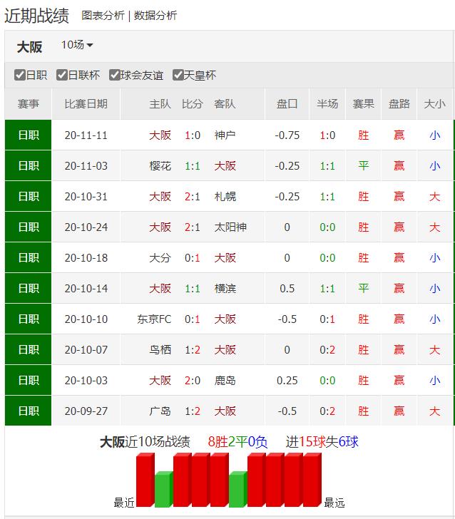 弱旅仙台七夕本赛季日职联26轮积14分排名垫底,不过无降级之忧。主力前锋长泽骏曾效力大阪钢巴3年时间,本赛季相继攻破川崎、鹿岛等强队的球门。上周末主场0:3脆败给下游队鸟栖沙岩,延续低迷走势,且球队目前仍没有换帅。近6轮联赛有4场都在上半场保持零封,对手包括劲旅名古屋和强队广岛。