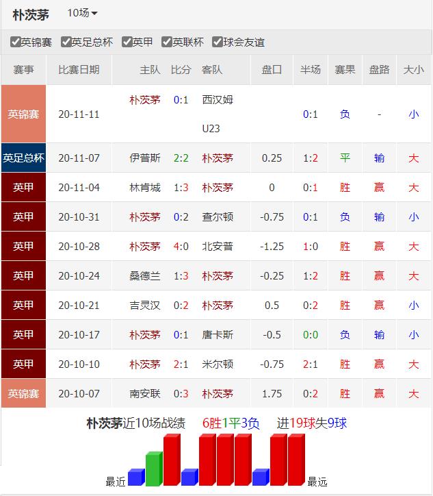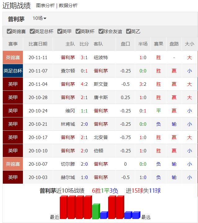 英甲强队朴茨茅斯近3个赛季均排名英甲联赛前8位,前两个赛季均排名英甲联赛第四,但进入升级附加赛后均以失败告终。目前11场联赛过后积20分排名联赛第7位,距离前六升级区仅有1分距离,距离榜首5分。近6次面对普利茅斯3胜3平未尝败绩,并且近3次客场挑战普利茅斯均以平局收场,表现出色。上周接连在英锦赛以及足总杯当中取得晋级,其中足总杯为客场比赛,3-2加时淘汰了伊普斯维奇。近5场英甲联赛赢下了4场,并且其中4场胜场当中3场是客场比赛,本赛季客场5场比赛4胜1平胜率高达80%。