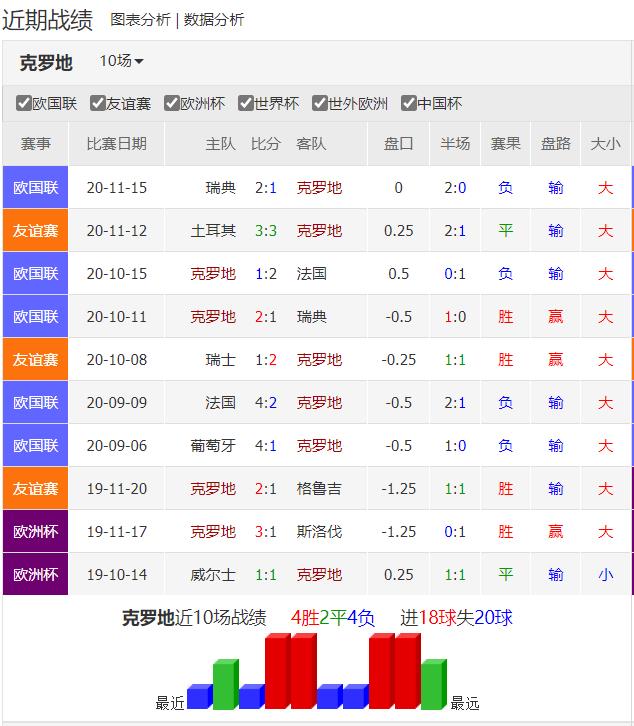欧洲强队克罗地亚目前世界排名第9,欧洲排名第4位,上赛季欧国联排名A级4组第三位。现役射手王佩里西奇入选大名单,国家队各项赛事出场95次打进26球目前排名历史射手榜第四,上赛季跟随拜仁拿到三冠王。坐拥莫德里奇、科瓦西奇、布罗佐维奇、洛夫伦等一流球星,并且曾于2018年夺得世界杯亚军。目前排名A级3组第三位,目前战绩1胜4负,与排名垫底的瑞典同积3分,距离第二名葡萄牙已有7分差距。在今年的各项赛事当中还未遭到过零封,每一场比赛克罗地亚队不论胜负都能够敲开对手的大门,进攻效率稳定。