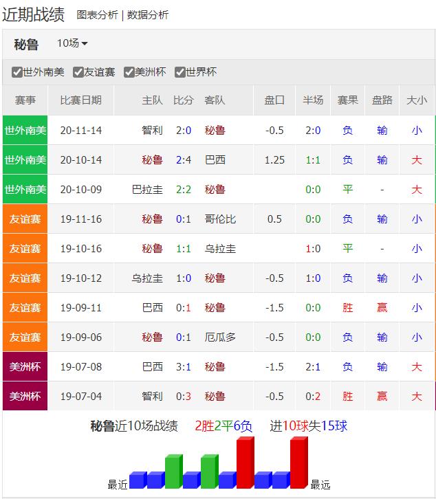 秘鲁防守表现糟糕,过去3仗分组赛输足2场,目前正遭遇两连败打击,而且均场失球超过2.5球,是役面对实力强劲的阿根廷,秘鲁凶多吉少。