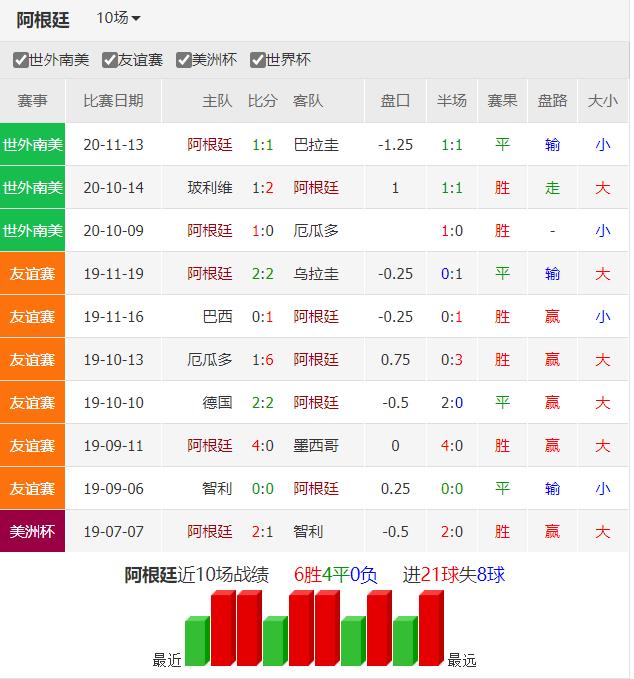 南美顶级球队阿根廷目前世界排名第8位,上一次世界杯南美区预选赛拿到28分排名第三落后于巴西与乌拉圭队。在上一届世预赛南美预赛的比赛时阿根廷队18场比赛仅丢16球,仅仅比榜首巴西队多丢了5球,防守表现非常出色。本次大名单中依然出现了迪玛利亚、梅西、洛赛尔索、帕雷德斯、奥塔门迪、塔利亚菲科等熟悉的身影,人员配置整齐。在上一场预选赛上主场1-1战平巴拉圭,在控球率接近7成的情况下依然无法赢球,进攻效率较低。目前3轮世预赛过后2胜1平积7分排名南美第二位,距离榜首的巴西队仅差2分,表现出色。