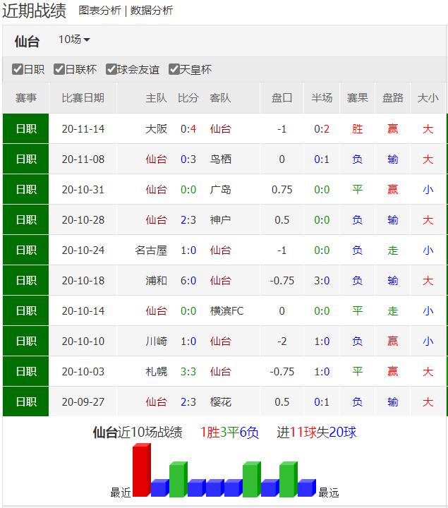 弱旅仙台七夕本赛季日职联27轮积17分排名垫底,不过无降级之忧。近9次J1主场对阵东京FC6胜3负优势明显,其中4次保持零封。上周末做客4:0横扫小幅轮换的强队大阪钢巴,前锋长泽骏面对旧主上演帽子戏法。主力边卫柳贵博继伤缺3轮后,上轮伤愈复出便打入1球,但本轮租借回避。