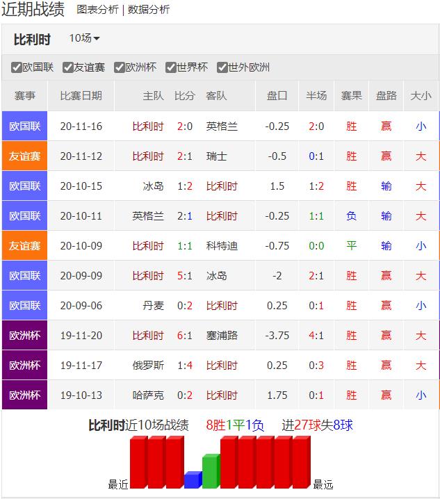 目前世界排名与欧洲排名均为第一,上赛季欧国联小组赛净胜球不敌瑞士未能从A级第2组晋级半决赛。主场目前已长达两年时间在各项赛事中未尝败绩了,并且近来欧国联的4场主场赛事全部取胜,欧国联主场胜率100%。目前5轮小组赛过后打进12球场均进球2.4球,是现在欧国联A级赛事当中进球最多的球队,坐拥顶级进攻球员的锋线效率颇高。头号射手卢卡库目前效力于意甲豪门国际米兰,近年来国家队赛事出场88场打进55球是目前比利时国家队的队史射手王目前5轮过后4胜1负积12分排名小组第一,领先本场对手丹麦队2分,若本场比赛不败将会直接小组晋级到半决赛赛事当中。在上一轮小组赛上主场2-0击败英格兰成功复仇,上半场25分钟前蒂勒芒斯与梅尔滕斯就打进就两粒制胜进球。中场蒂勒芒斯上一轮打进关键进球,将自己联赛的好状态成功带回了国家队,凭借上一场比赛的出色发挥还拿到了当场最佳球员。
