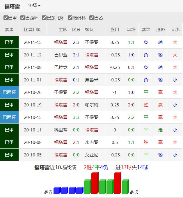 巴甲中游队福塔雷萨今年暂时排名联赛第12,领先降级区只有2分。今年主场联赛10战5胜2平3负拿到17分,而客场1胜4平5负只拿7分,主客差距明显。上一场联赛主场2比3不敌圣保罗,最近4场联赛全部输球,尤其最近3场联赛每场都丢了不止1球。上一场联赛在主场打进圣保罗队2球。球队最近3场联赛场场进球,进攻状态不差。