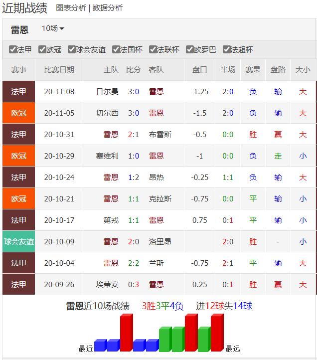 雷恩本赛季10轮战罢积18分排名第3,领先欧战区外球队1分。两队近6次交手雷恩4胜2平,胜率67%。上轮联赛客场0-3不敌大巴黎,迪马利亚两射一传,后防被其一人打爆。各项赛事近6场比赛1胜1平4负,在双线作战的情况下阵容厚度还是稍显不足,战绩较为糟糕。