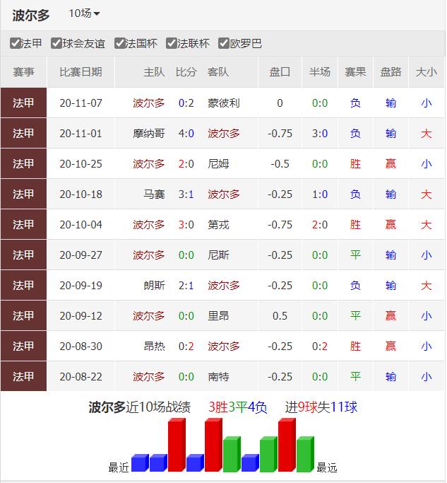 波尔多本赛季10轮战罢积12分排名第12,比上赛季同期多3分,表现中规中矩。本赛季主场战绩排名第8,而客场战绩排名倒数第3,是典型的客场虫。本赛季场均拦截15.4次,该项统计排名联赛第2,而雷恩只有10.7次,排名倒数第3。主力中卫科斯切尔尼场均贡献3次拦截,排名第3,是后防中坚,他近期伤愈复出。上轮联赛主场0-2不敌蒙彼利埃,蒙彼利埃多名主力后场缺阵的情况下,阵型过于靠前被反击击溃。近4场比赛1胜3负,场均失2.25球,近期防守质量明显下滑。
