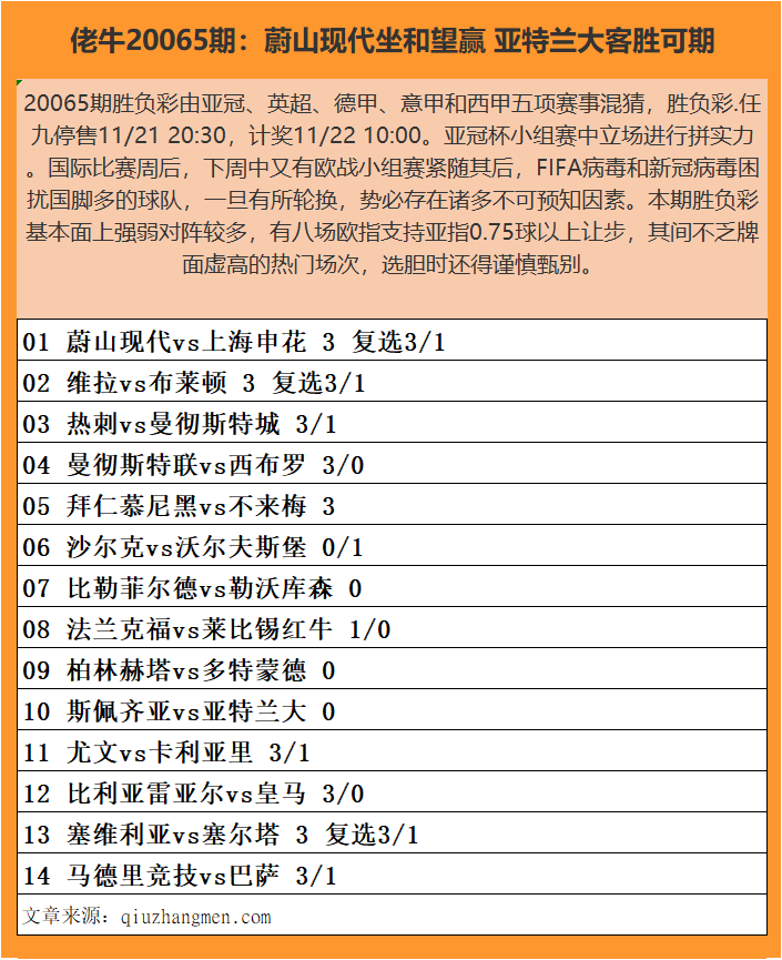 20065期胜负彩由亚冠、英超、德甲、意甲和西甲五项赛事混猜,胜负彩.任九停售11/21 20:30,计奖11/22 10:00。亚冠杯小组赛中立场进行拼实力。国际比赛周后,下周中又有欧战小组赛紧随其后,FIFA病毒和新冠病毒困扰国脚多的球队,一旦有所轮换,势必存在诸多不可预知因素。本期胜负彩基本面上强弱对阵较多,有八场欧指支持亚指0.75球以上让步,其间不乏牌面虚高的热门场次,选胆时还得谨慎甄别。