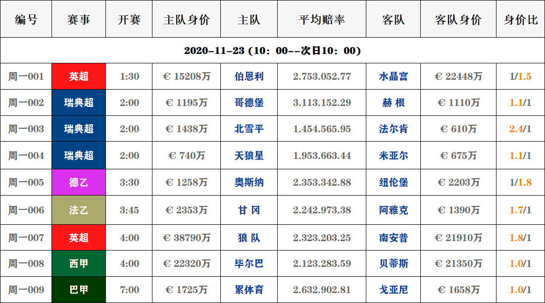 11月23日|周一球队身价对阵数据信息汇总