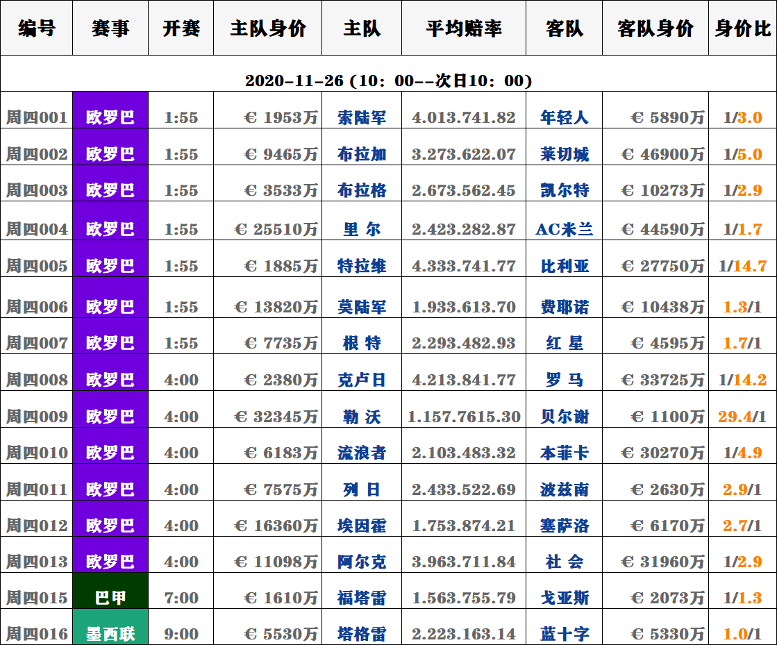26日足球赛事|周四足球 球队对阵身价数据信息汇总
