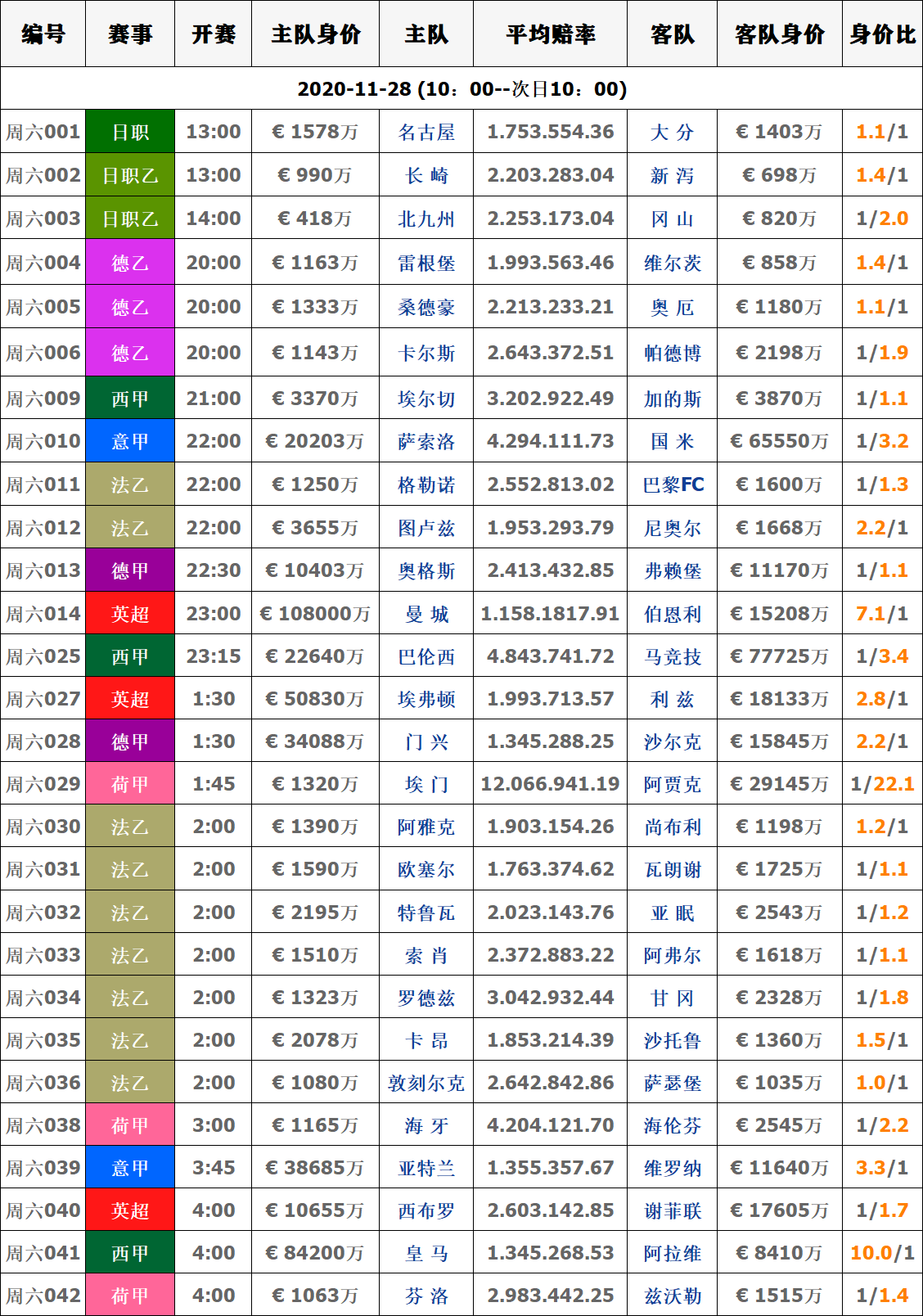 28日足球赛事|周六球队对阵身价数据信息汇总