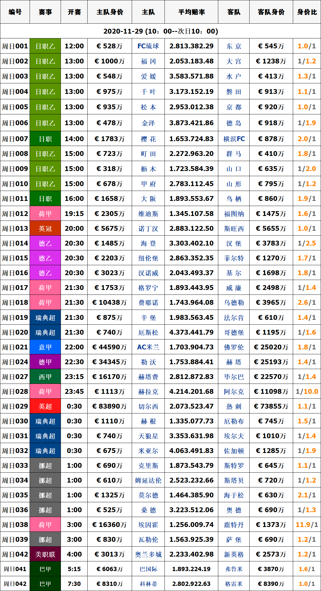 29足球赛事|周日球队对阵身价数据信息汇总