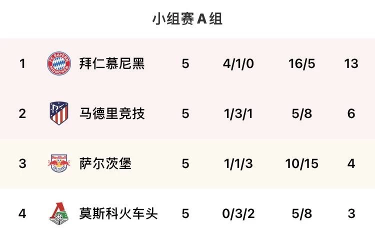 球掌门12月2日获悉: 欧冠第五轮A组的比赛全部结束,莫斯科火车头主场1-3不敌萨尔茨堡红牛,马竞主场1-1战平拜仁。
