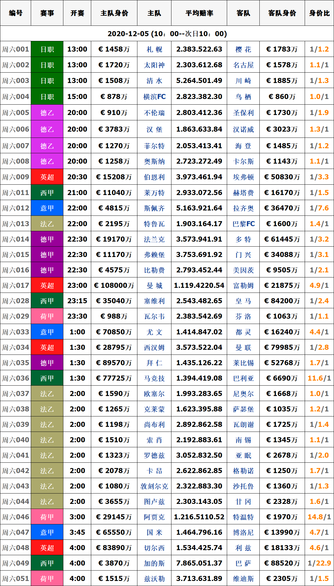 足球赛事|周六球队对阵身价数据信息汇总