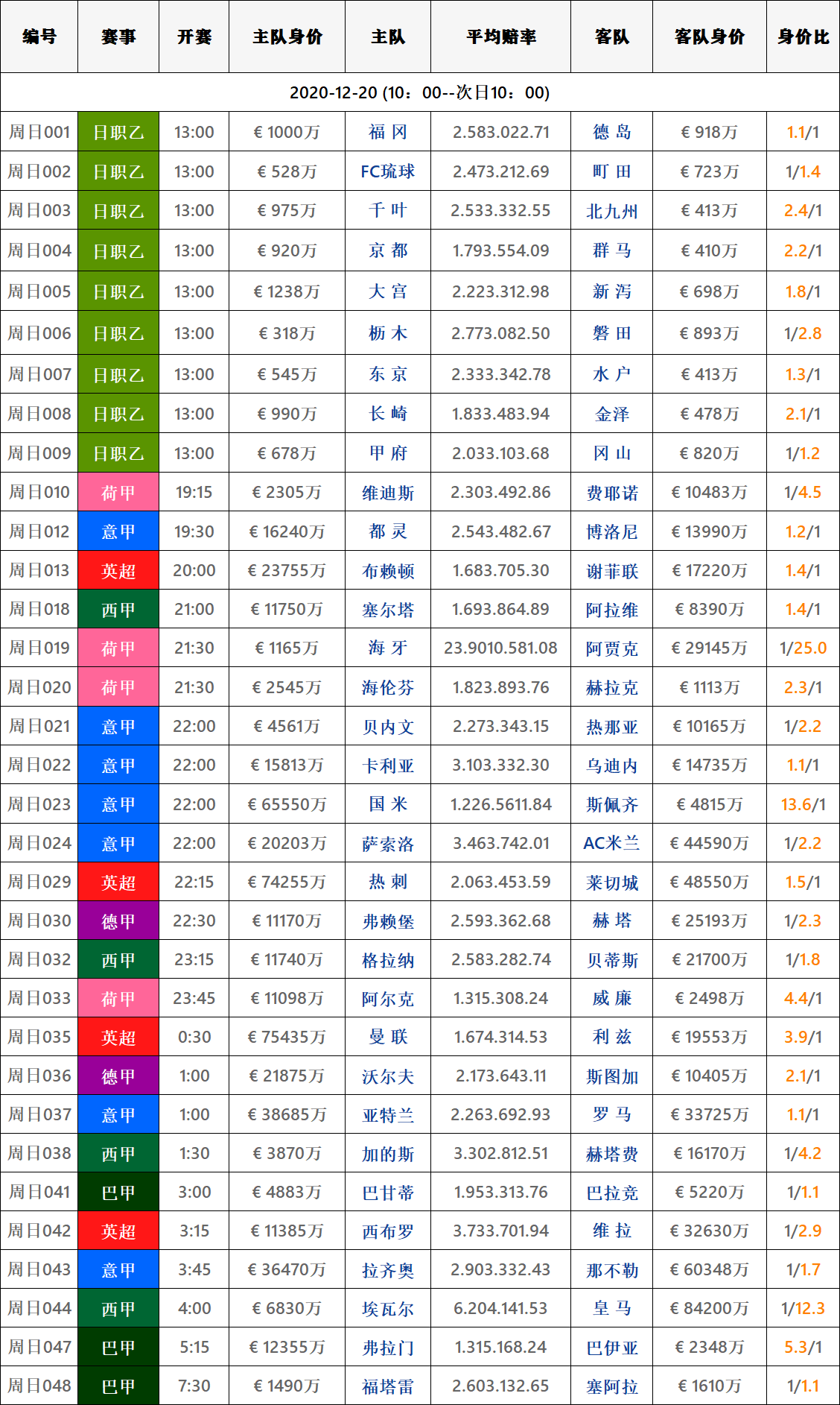 20日赛事|周日足球球队对阵身价数据信息汇总