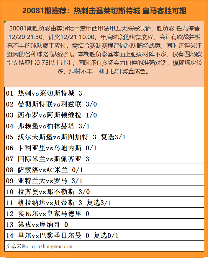 20081期胜负彩由英超德甲意甲西甲法甲五大联赛混猜,胜负彩 任九停售12/20 21:30,计奖12/21 10:00。年底时段的密集赛程,会让有欧战并板凳不丰的球队疲于应付,需结合赛制赛程评估球队临场战意,同时还得关注逛网的各种球路临场资讯。本期胜负彩基本面上强弱对阵不多,仅有四场欧指支持亚指0 75以上让步,同时还有多场实力伯仲的准强对话,模糊场次较多,胆材不丰,利于提升奖金成色。