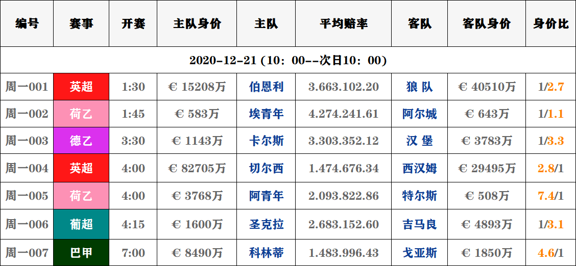 21足球赛事|周一足球球队对阵身价数据信息汇总