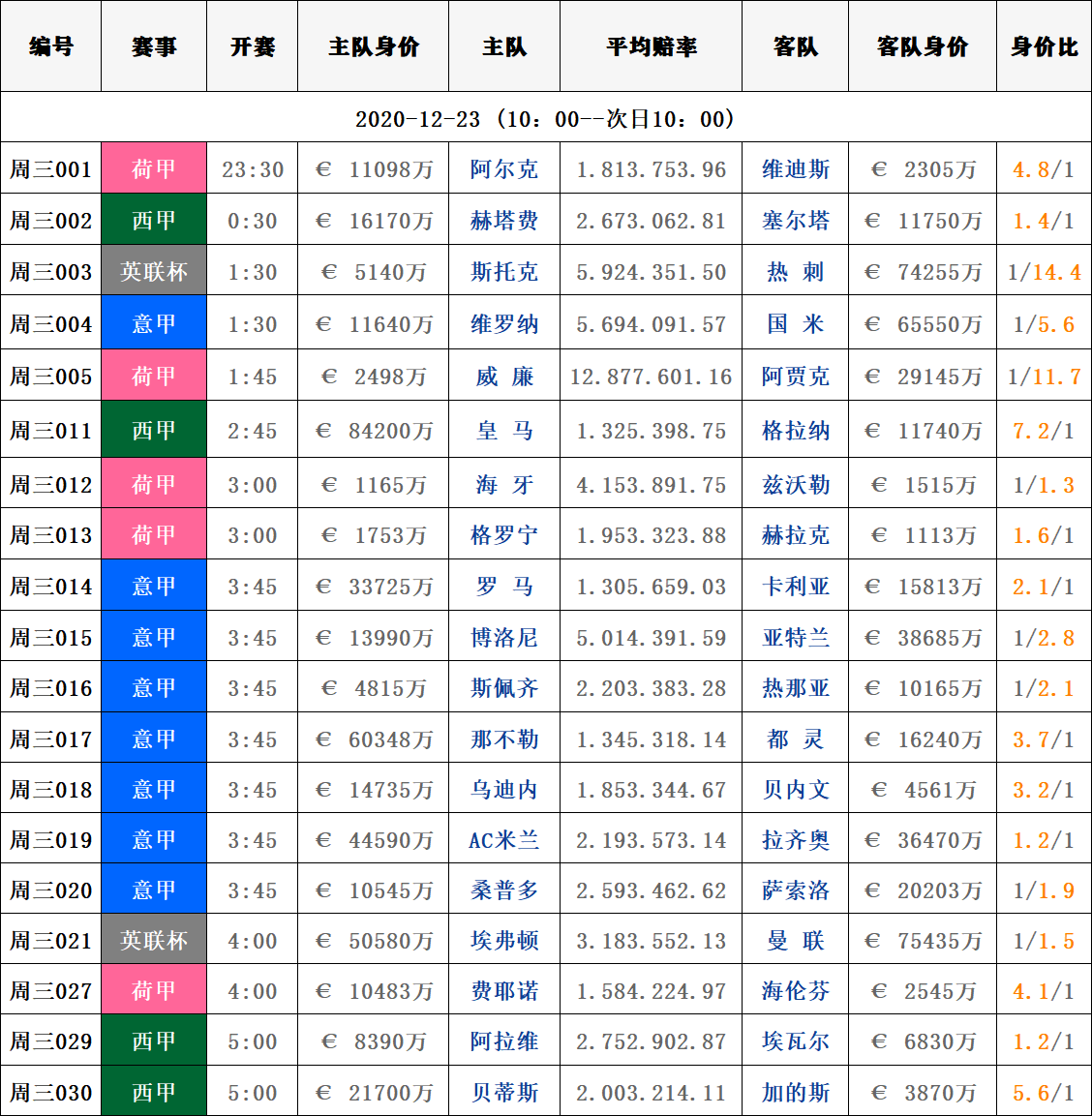 23日赛事|周三足球球队对阵身价数据信息汇总