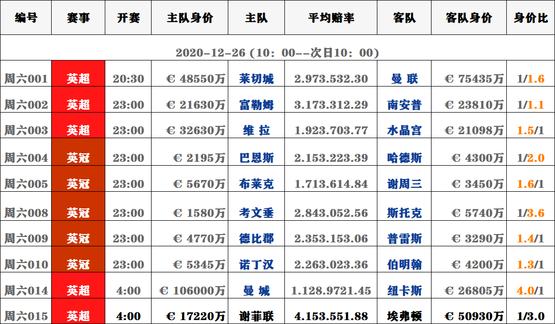 25日赛事|周六足球球队对阵身价数据信息汇总