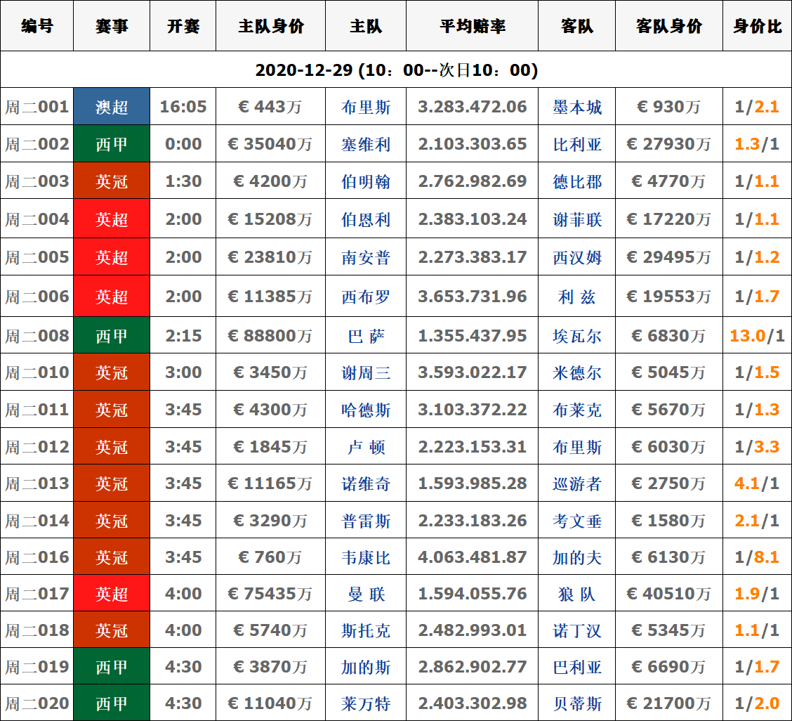 29日足球赛事|周二球队对阵身价数据信息汇总