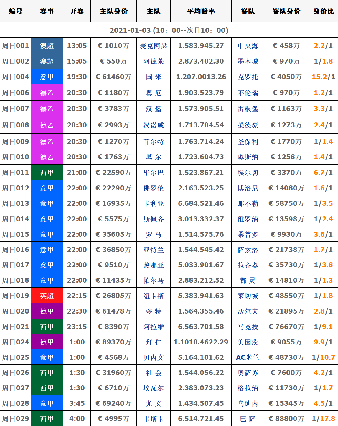 3日赛事|周日足球球队对阵身价数据信息汇总