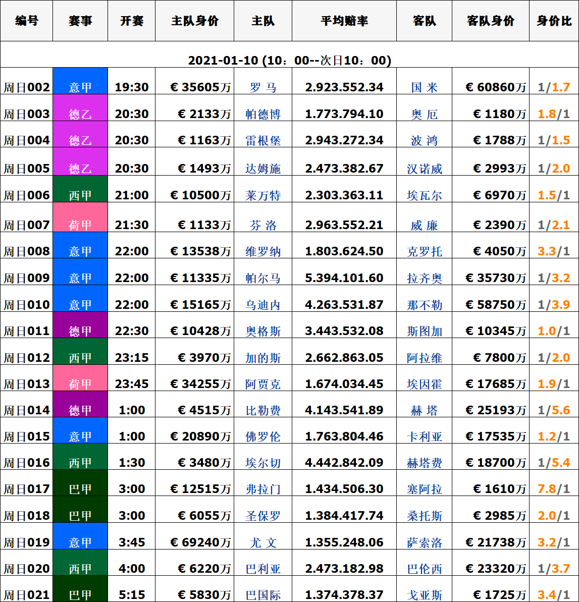 10日赛事|周日足球对阵身价数据信息汇总表