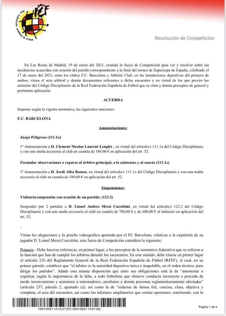 球掌门1月19日获悉:根据西班牙竞赛委员会的公告,梅西在西班牙超级杯决赛上的红牌被禁赛两场,同时罚款梅西600欧元,对巴萨俱乐部罚款700欧元。据悉巴塞罗那俱乐部已经对此提出上诉。