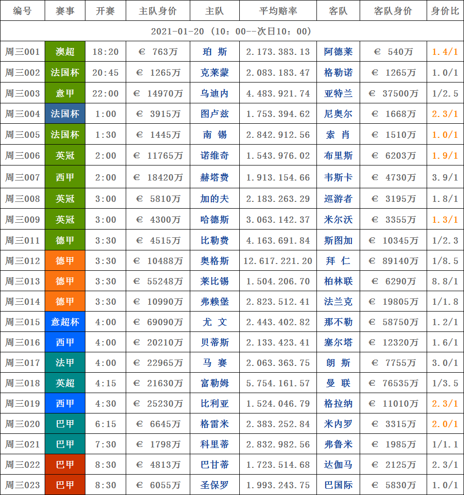 01月20日|周三足球赛事对阵身价表