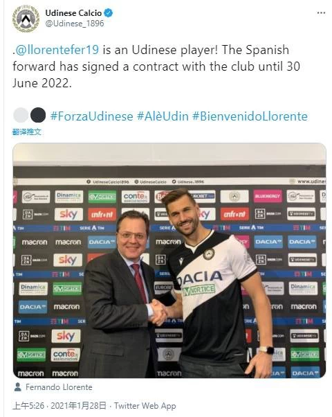球掌门1月28日获悉 乌迪内斯官方宣布,俱乐部从那不勒斯引进费尔南多-略伦特,这位35岁的西班牙前锋与乌迪内斯签约至2022年6月30日。