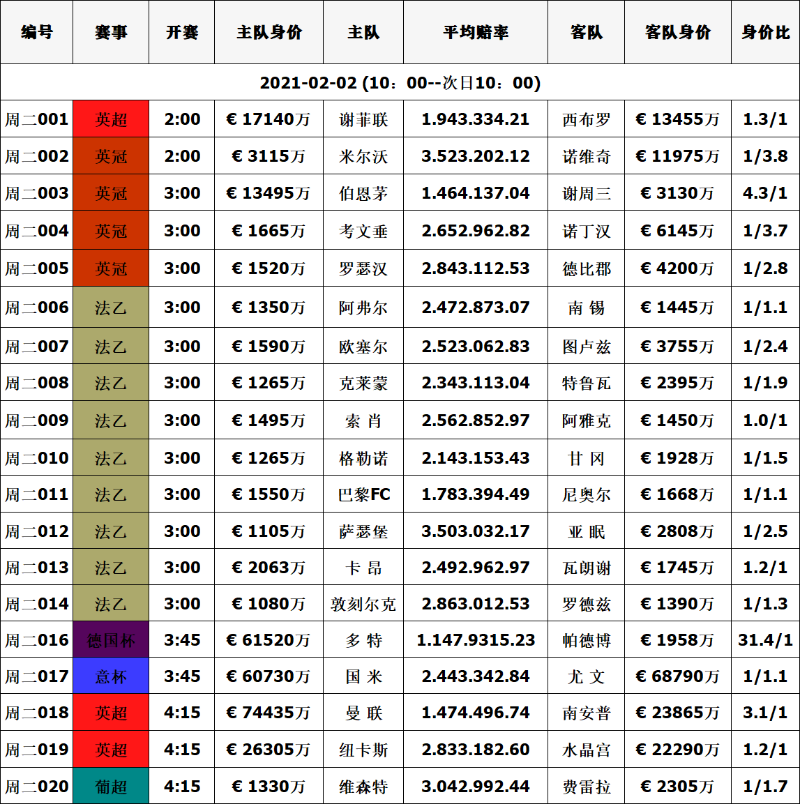 2日足球赛事|周二球队对阵身价数据信息汇总表