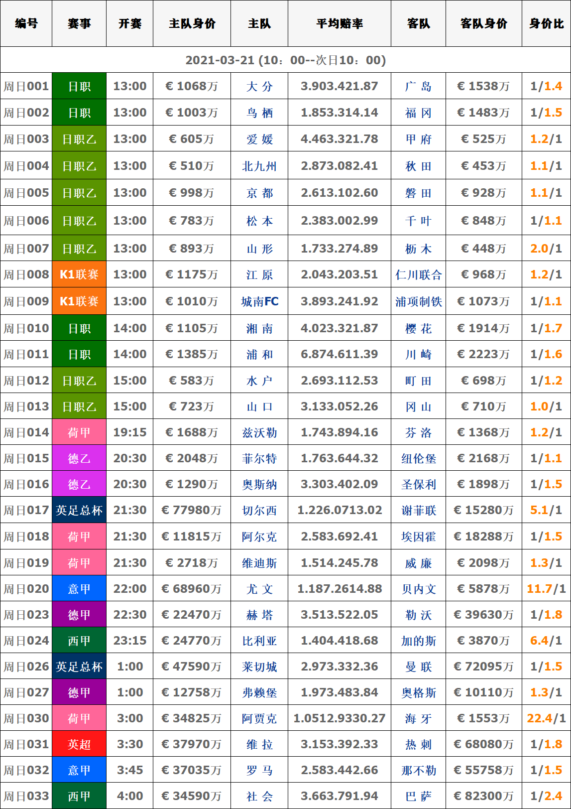 3月21日赛事|周日足球球队对阵身价数据表