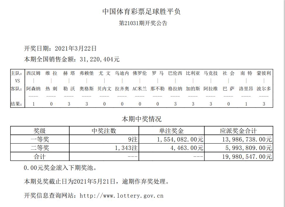 首页/ 赛事正文北京时间3月22日,胜负彩第21031期结束了全部14场比赛的争夺。本期开出一等奖9注,单注1554082.00元,二等奖1343注,单注奖金4463.00元。本期冷门比赛有4场,尤文主场0-1负于贝内文托爆出1赔16大冷,杀伤力十足;英超阿森纳3-3战平铁锤帮、德甲勒沃库森0-3输球、法甲南特1-1战平洛里昂均打出1赔3以上小冷。