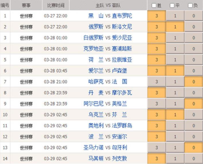 第033期仍然全部是世欧预赛事,从对阵来看很难出现大冷,毕竟强弱分明的比赛太多,而大多数弱队都没有爆冷实力,例如哈萨克斯坦对阵法国,阿尔巴尼亚对阵英格兰的比赛,虽然都是主场作战,但两队很难给传统世界劲率带来什么真正的麻烦。
