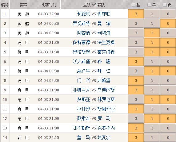 首页/ 赛事正文034期足彩头奖开出133注,单注奖金94763元。本期胜负彩14场比赛全部由五大联赛场次组成,其中德甲和意甲各有5场比赛,成为本期赛事大户,此外还有英超场次3场,西甲场次1场。下面我们就本期的足彩比赛做出分析。