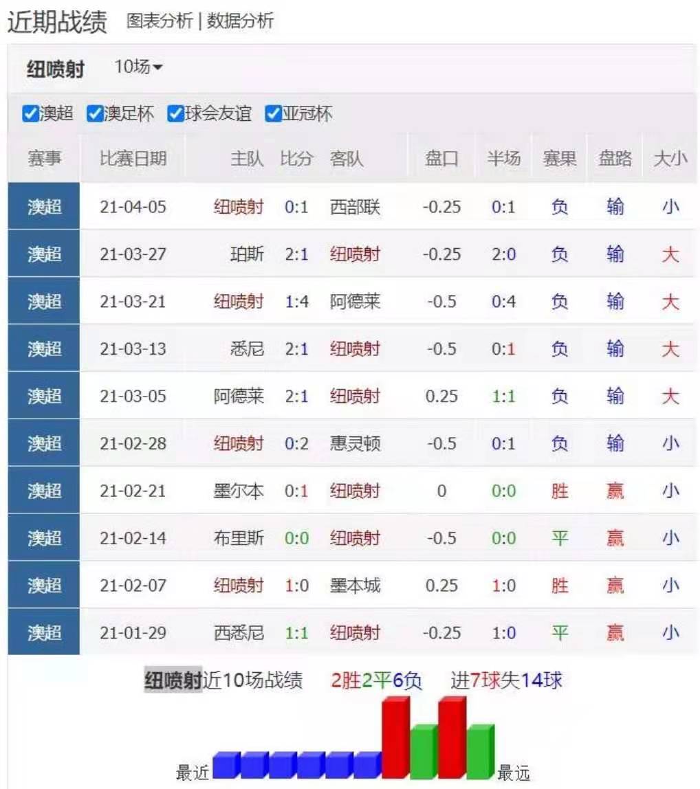 双方近6战都没有开胡,纽喷射6战全输,此时由半球调到半一,主队比较有利。