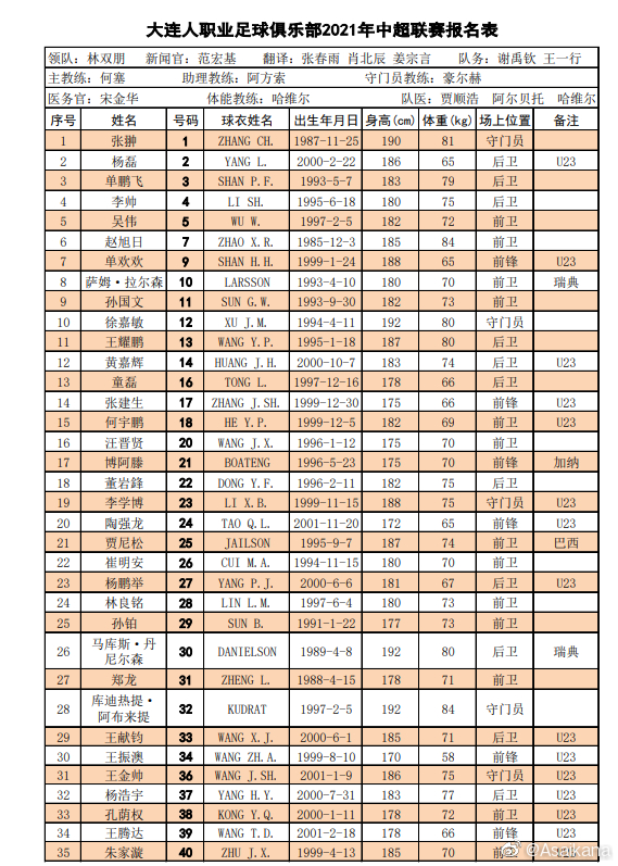 球掌门4月16日获悉:大连人足球俱乐部新赛季大名单出炉,拉尔森、博阿滕领衔,单欢欢9号。
