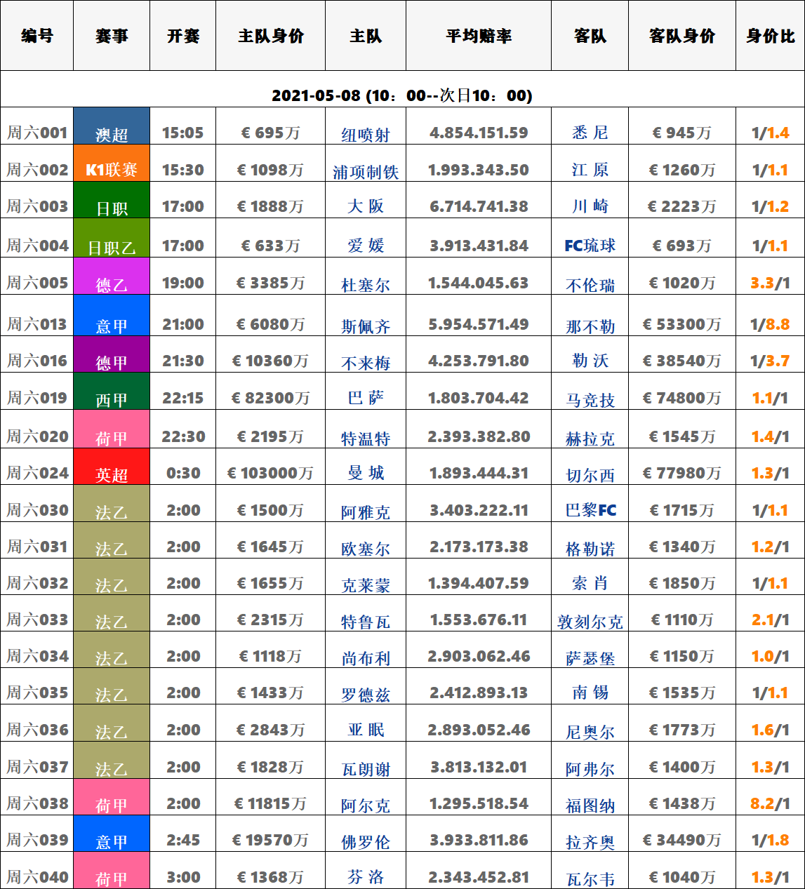 5月8日赛事|周六足球球队对阵身价数据信息汇总