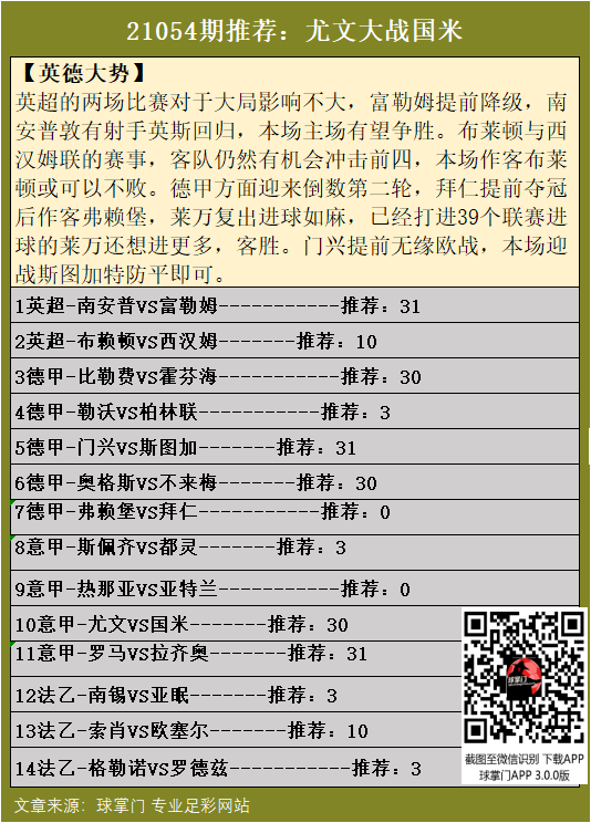 首页/ 赛事正文胜负彩2021054期竞猜英超+德甲+意甲为主,本期5月15日(周六)20点30分截止,敬请留意。