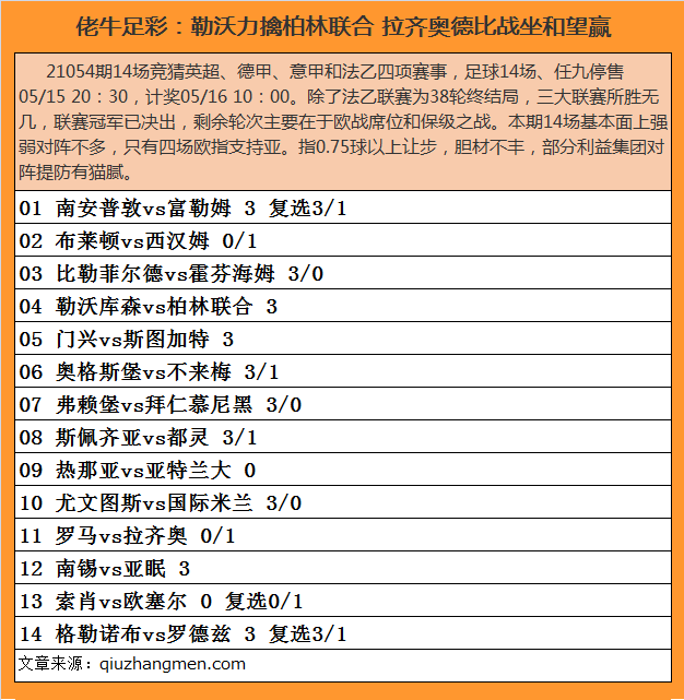 21054期14场竞猜英超、德甲、意甲和法乙四项赛事,足球14场、任九停售05/15 20:30,计奖05/16 10:00。除了法乙联赛为38轮终结局,三大联赛所胜无几,联赛冠军已决出,剩余轮次主要在于欧战席位和保级之战。本期14场基本面上强弱对阵不多,只有四场欧指支持亚。指0.75球以上让步,胆材不丰,部分利益集团对阵提防有猫腻。