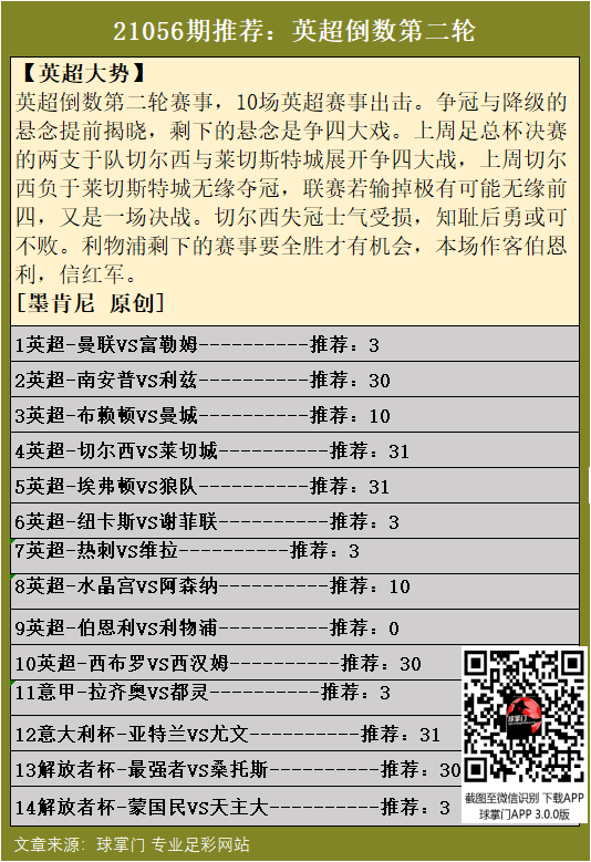 首页/ 赛事正文胜负彩2021056期竞猜英超为主,本期5月18日(周二)22点00分截止,敬请留意。