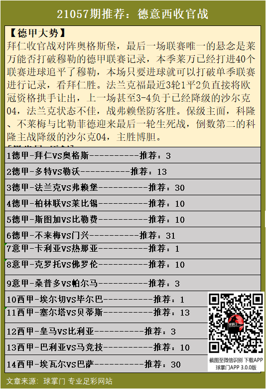 首页/ 赛事正文胜负彩2021057期竞猜德甲+意甲+西甲为主,本轮也是三大联赛的收官战,本期5月22日(周六)20点00分截止,敬请留意。