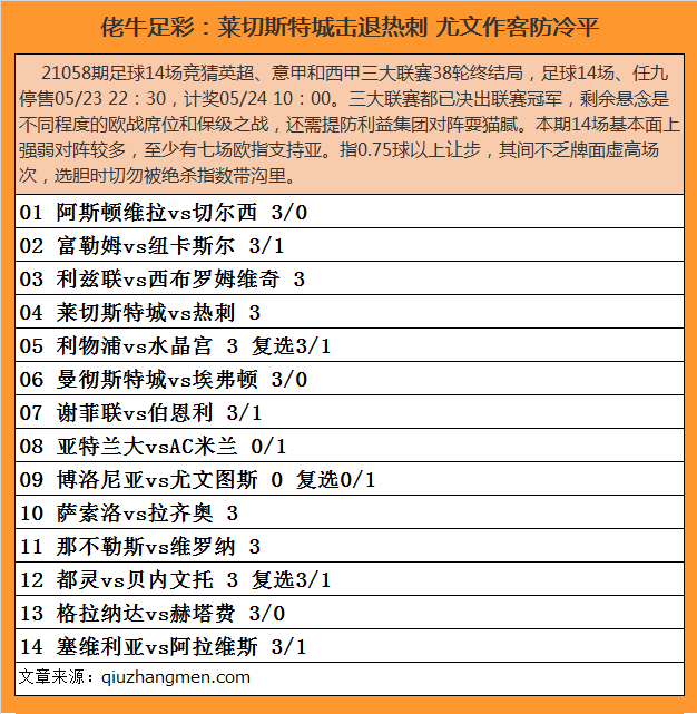 上期14场临场推荐14中13,招牌栏目任九11转9中10注。21058期足球14场竞猜英超、意甲和西甲三大联赛38轮终结局,足球14场、任九停售05/23 22:30,计奖05/24 10:00。三大联赛都已决出联赛冠军,剩余悬念是不同程度的欧战席位和保级之战,还需提防利益集团对阵耍猫腻。本期胜负彩基本面上强弱对阵较多,至少有七场欧指支持亚。指0.75球以上让步,其间不乏牌面虚高场次,选胆时切勿被绝杀指数带沟里。