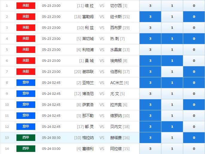 首页/ 赛事正文21058期的胜负彩是英超、西甲和意甲的比赛组成,联赛的收官阶段,很多球队比赛都已没有战意,但是也有几支争夺欧战的球队。本期的深度让步也比较多,本次期的14场整体中等。