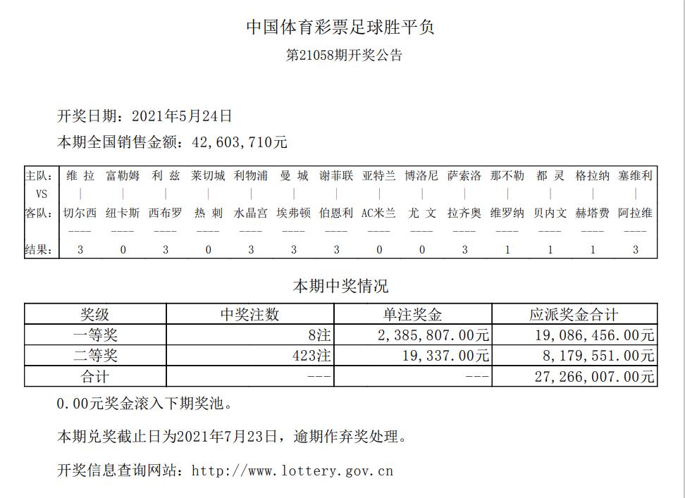 首页/ 赛事正文北京时间5月24日,胜负彩第21058期开奖结果揭晓。本期一等奖开出8注,单注奖金238万余元;二等奖开出423注,单注奖金1.9万余元;任九头奖开1569注8155元。本期胜负彩销量为42,603,710元,任九投注总额19,993,484元。