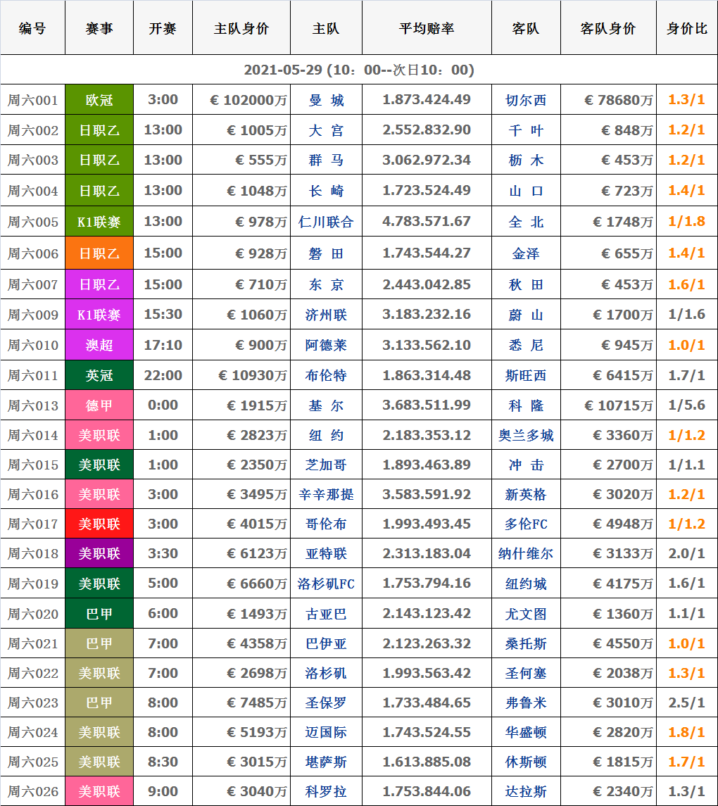 5月29日|周六足球对阵信息数据表