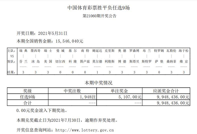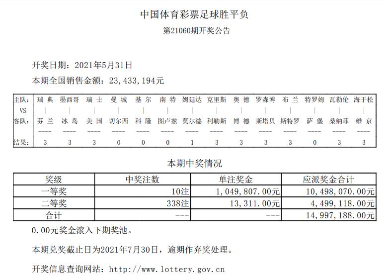 北京时间5月31日,胜负彩第21060期开奖结果揭晓。本期一等奖开出10注,单注奖金104万余元;二等奖开出338注,单注奖金13311元;任九头奖开1948注5107元。本期胜负彩销量为23,433,194元,任九投注总额为15,546,040元