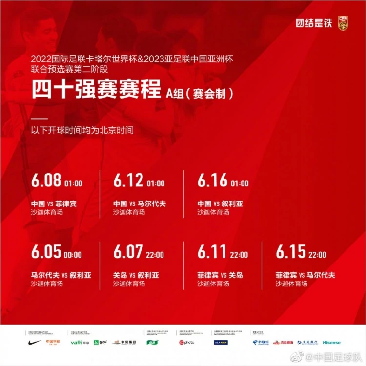 球掌门6月2日获悉:亚足联官方更新赛程,国足剩余3场40强赛均在当地时间(阿联酋沙迦)晚上9点开赛,即北京时间凌晨1:00开球。