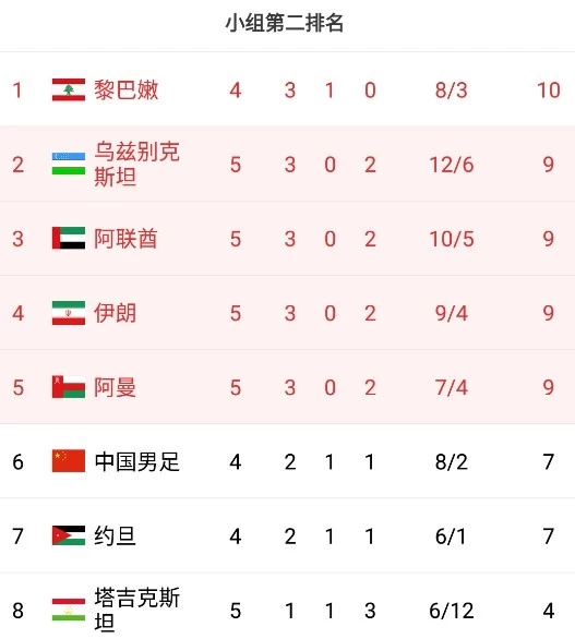 球掌门6月8日获悉:国足2-0菲律宾的比赛结束之后,在40强赛成绩最好的小组第二排名中,国足排名第五。之后乌兹别克斯坦5-0大胜新加坡升至本榜第二,国足下降一位在小组第二排名中暂居第六。