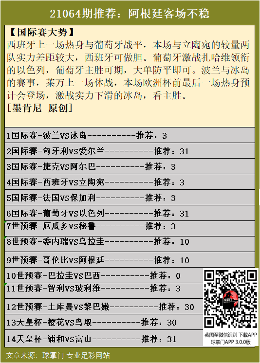 西班牙上一场热身与葡萄牙战平,本场与立陶宛的较量两队实力差距较大,西班牙可做胆。葡萄牙激战扎哈维领衔的以色列,葡萄牙主胜可期,大单防平即可。波兰与冰岛的赛事,莱万上一场休战,本场欧洲杯前最后一场热身预计会登场,激战实力下滑的冰岛,看主胜。